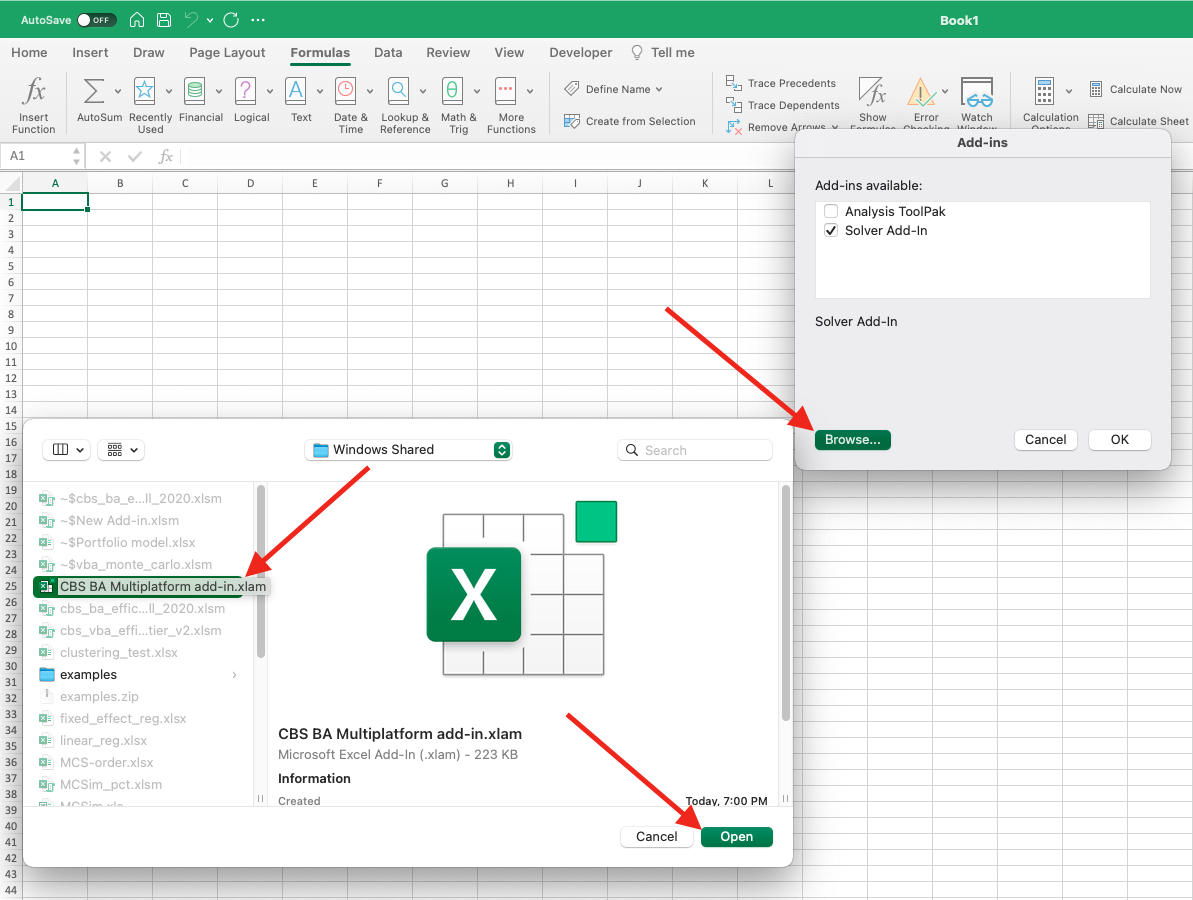 - Select the correct add-in file from the pop-up, and click on Open. For complete functionality, also select the Solver Add-in.